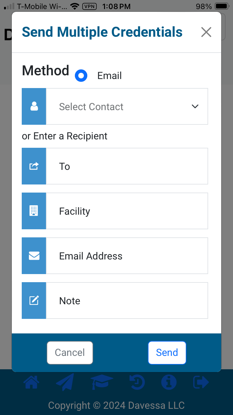 4: Either pick a name from the contact list or enter the name, facility and email address of the person you are sending the credentials to. You can also add a note to accompany the credential if you wish. Press SEND and your email will be immediately dispatched to the recipient.  (Note:  We also save details of the email you sent for your records in Sending History.)