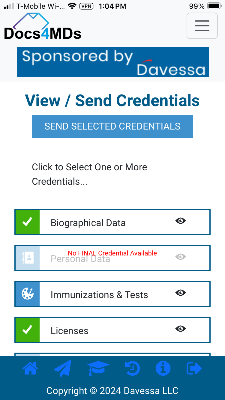 3:  If you want to send one (or more) credentials to someone, then tap or click on the icon on the left-hand side of the button.  (You can repeat for as many credentials as you would like to send.)  Once your selections are complete, tap or click on the SEND SELECTED CREDENTIALS button at the top of the screen.